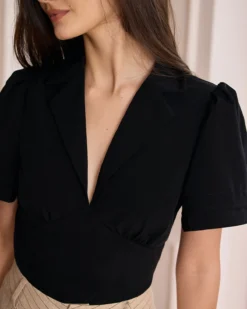 Crafted from a soft and stretchy knit fabric, this black top offers a comfortable and flattering fit that moves with you throughout the day. The classic black color makes it a versatile piece that can be easily paired with your favorite bottoms, whether it’s jeans, skirts, or trousers.