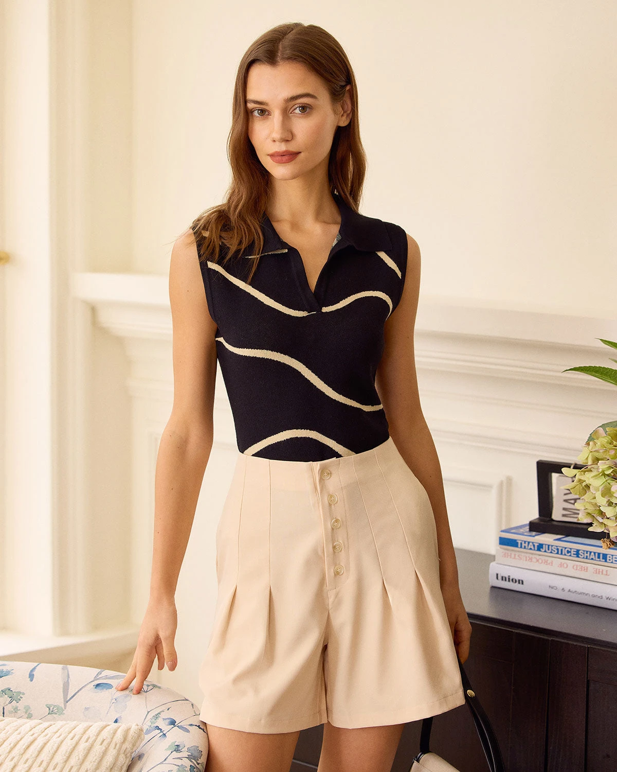 Crafted from luxurious knit fabric, this black tank top offers a soft and cozy feel against the skin while maintaining a polished appearance. The collared neckline adds a touch of refinement, perfect for both casual and dressier occasions.