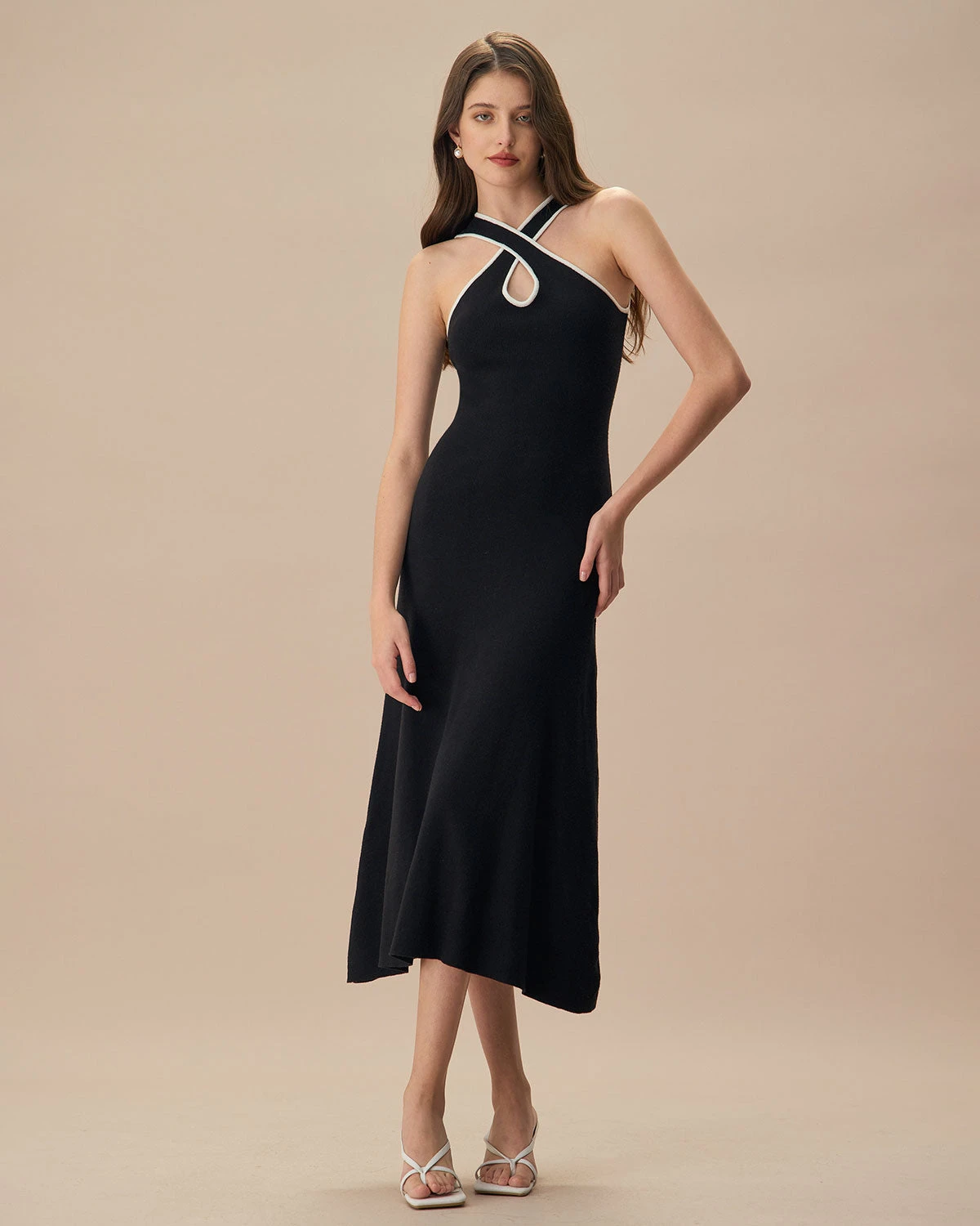Designed with intricate cut-out details and contrasting knit patterns, this halter midi dress combines contemporary style with classic elegance. The black hue adds a touch of timeless sophistication, while the cut-out accents create a modern, eye-catching look. Perfect for evening events or upscale gatherings.