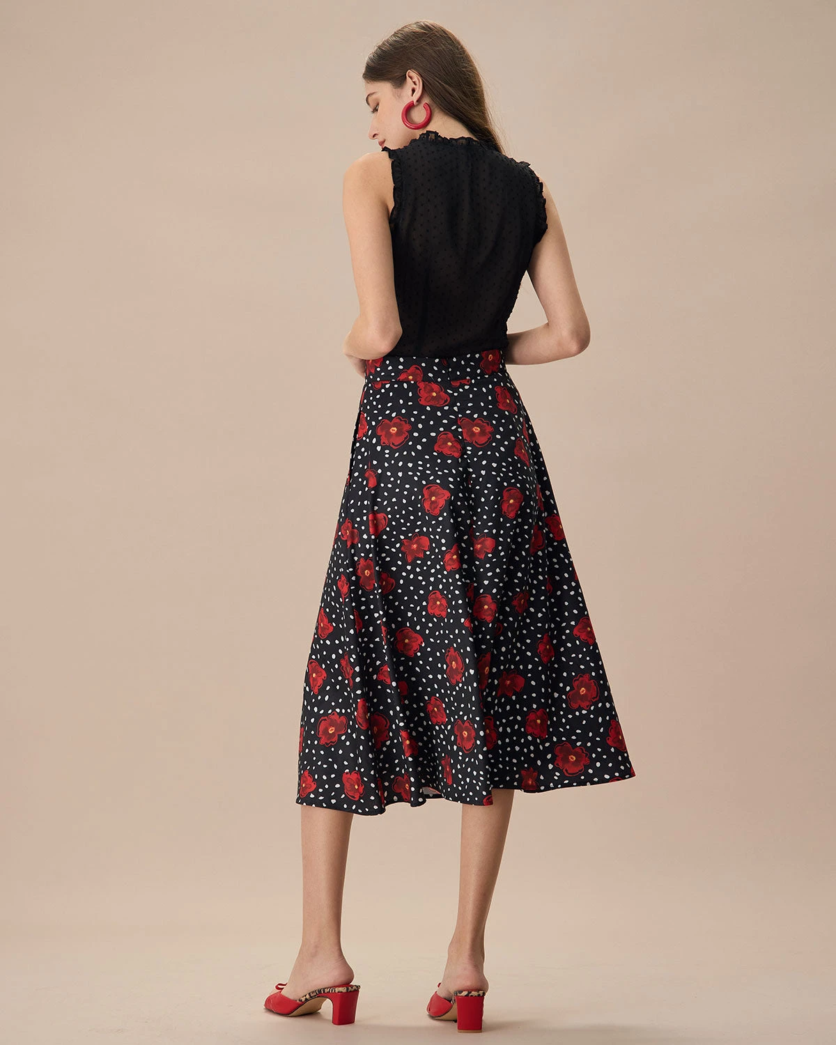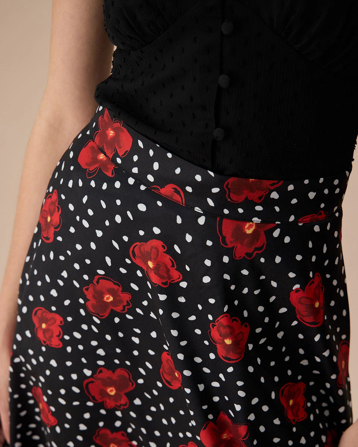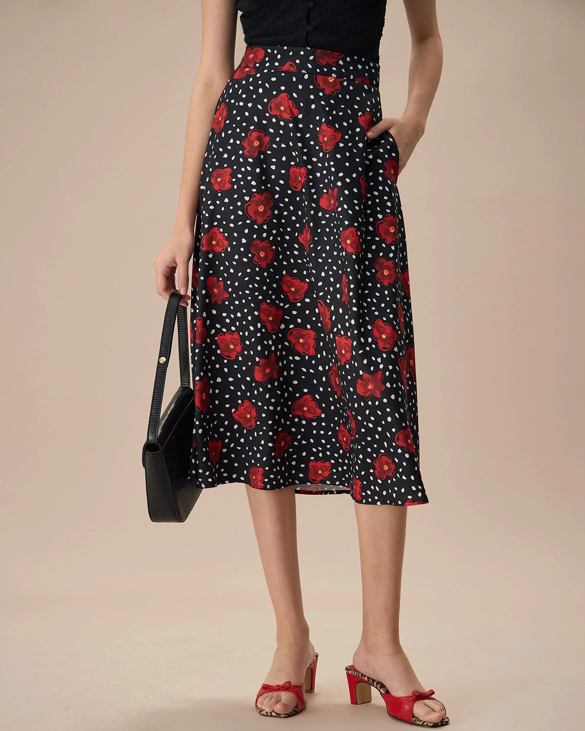 This skirt features a high-waisted design that accentuates the waist, creating a flattering silhouette. The elegant floral pattern adds a touch of timeless charm, while the practical pockets provide a functional and stylish detail.Â