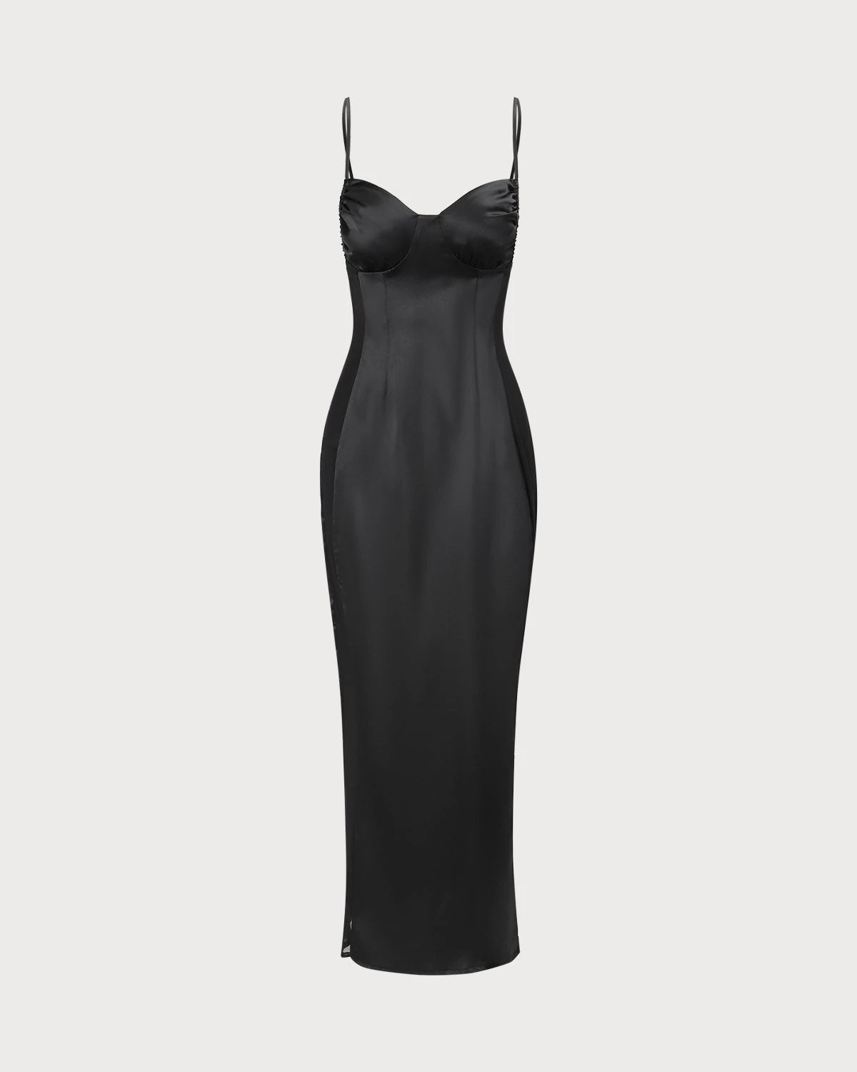 The Black V Neck Mesh Satin Slip Maxi Dress