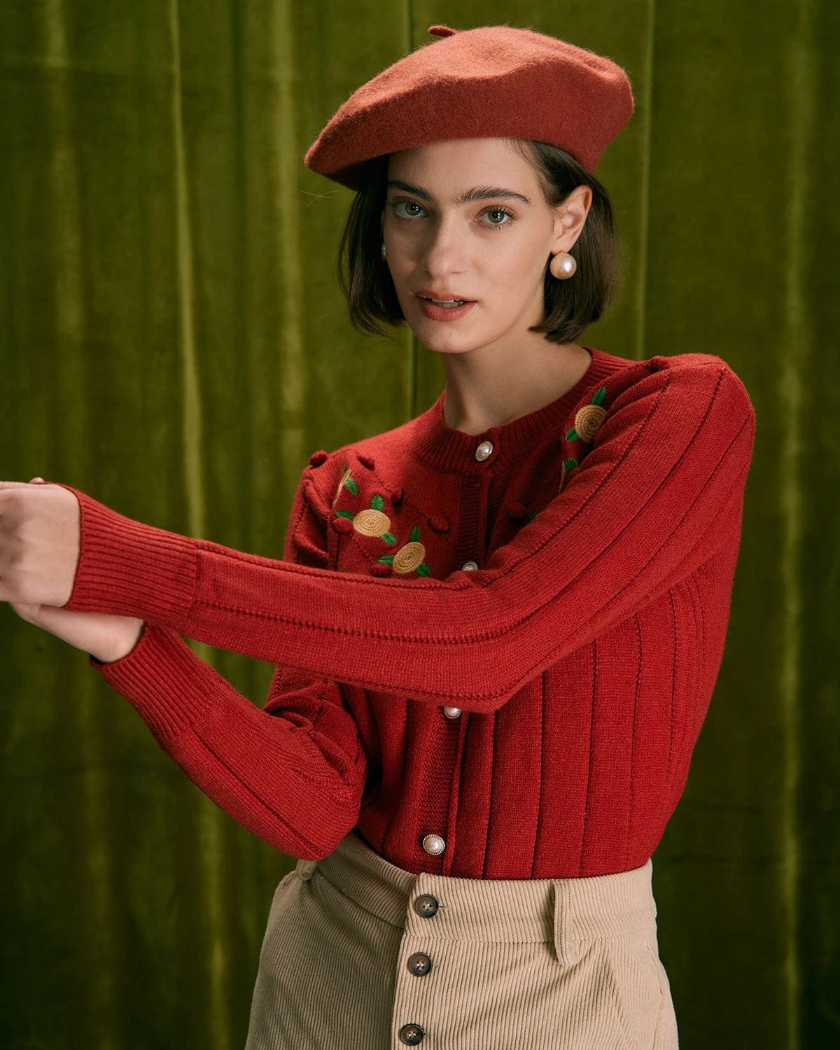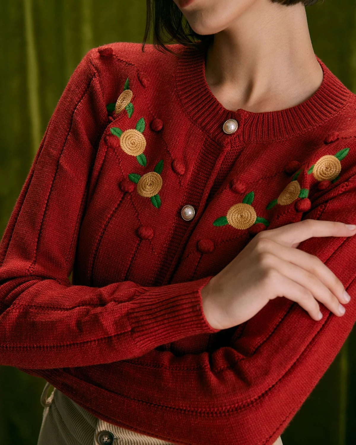 Soft spot. This Cardigan is slim fitting throughout with floral embroidered and has center-front buttons so you can wear it open or closed. It has soft, stretchy wool fabric so it’s super comfortable and warm.