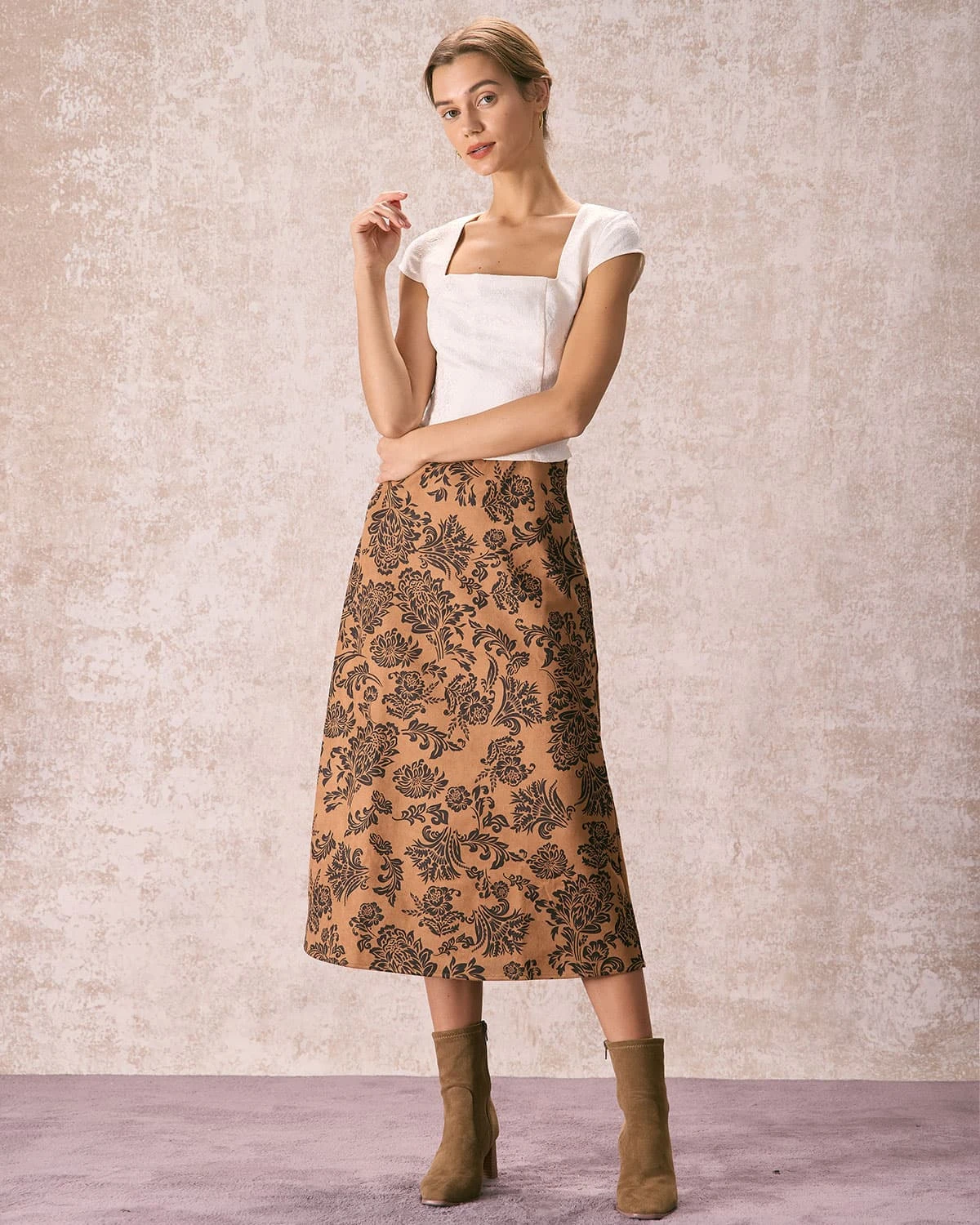 This High Waisted Skirt is a versatile piece that combines feminine style with modern comfort. The suede and floral print detail adds a touch of elegance and pairs well with a variety of tops. The zipper fly and high waisted design create a classic silhouette with a modern twist, perfect for any occasion. Whether dressed up with heels or dressed down with sneakers, this skirt is a must-have addition to any wardrobe.