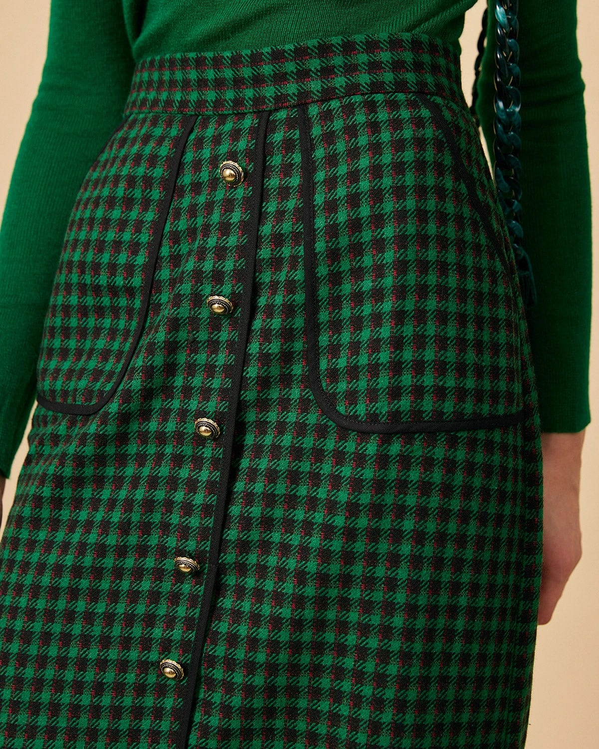 This midi skirt is a classic retro vibe that mixes the classic look of a plaid tweed skirt with a modern, chic fake button front. The high-waisted style and flattering pocket detailing make this skirt perfect for work or date nights with a pair of heels or flats.
