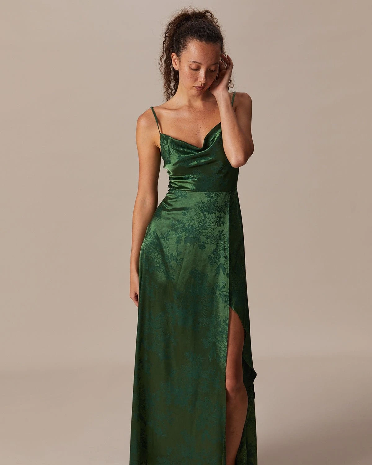 The Green Cowl Neck Jacquard Satin Maxi Dress