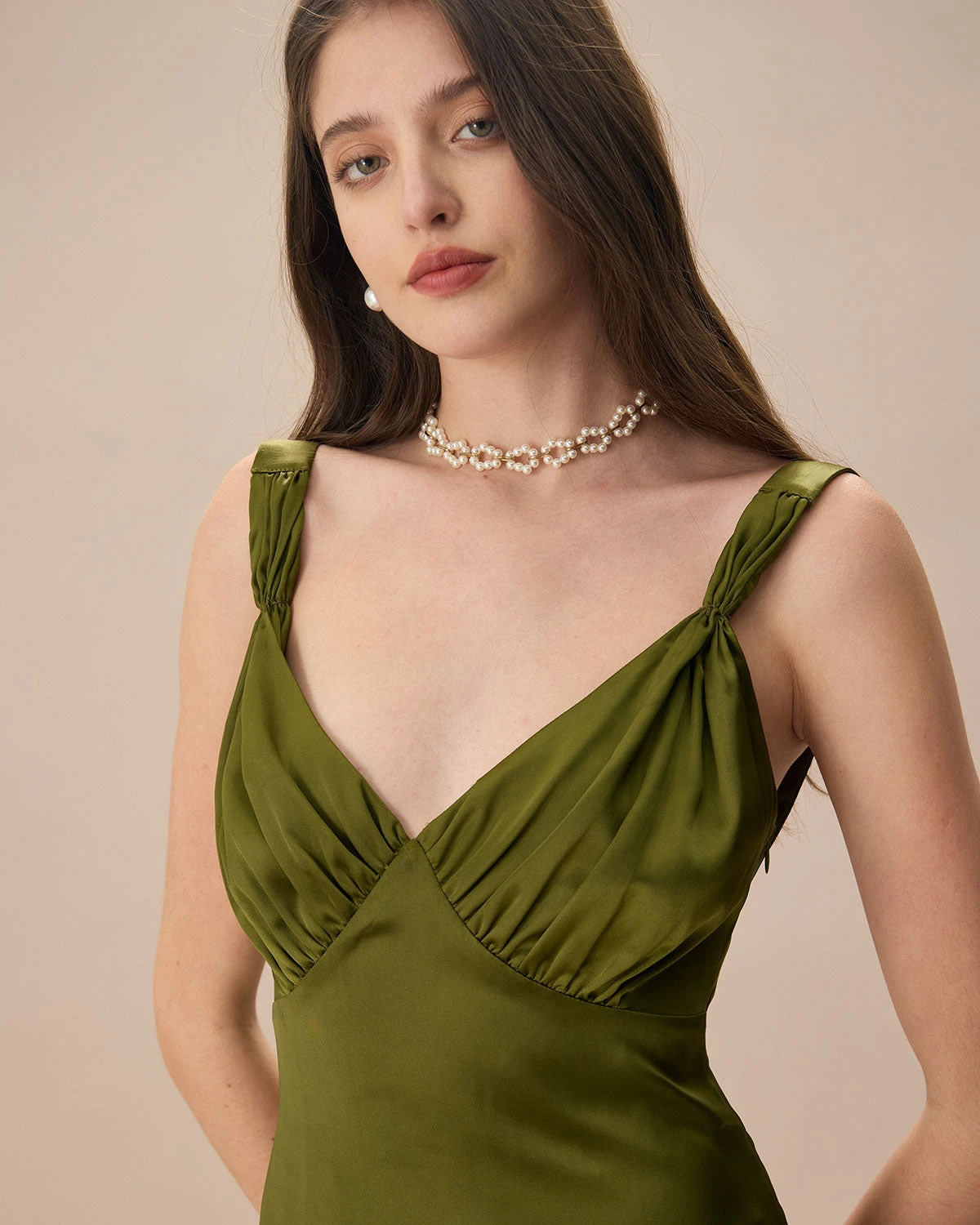 This exquisite maxi dress features a deep V neckline, adding a touch of sophistication while accentuating the décolletage. The ruched detailing throughout the dress provides a flattering fit and elegant texture, enhancing the overall silhouette.