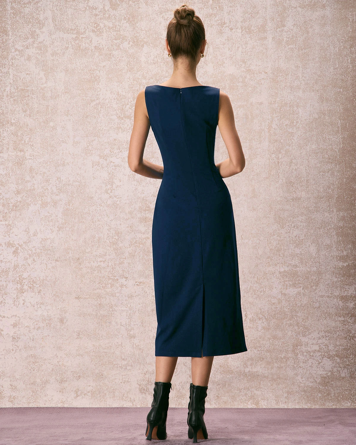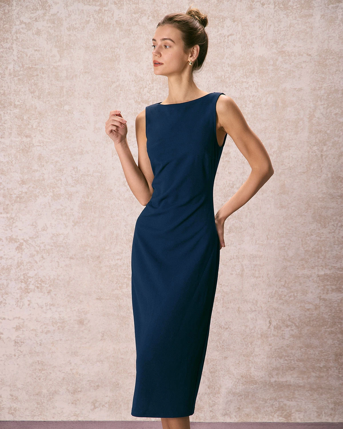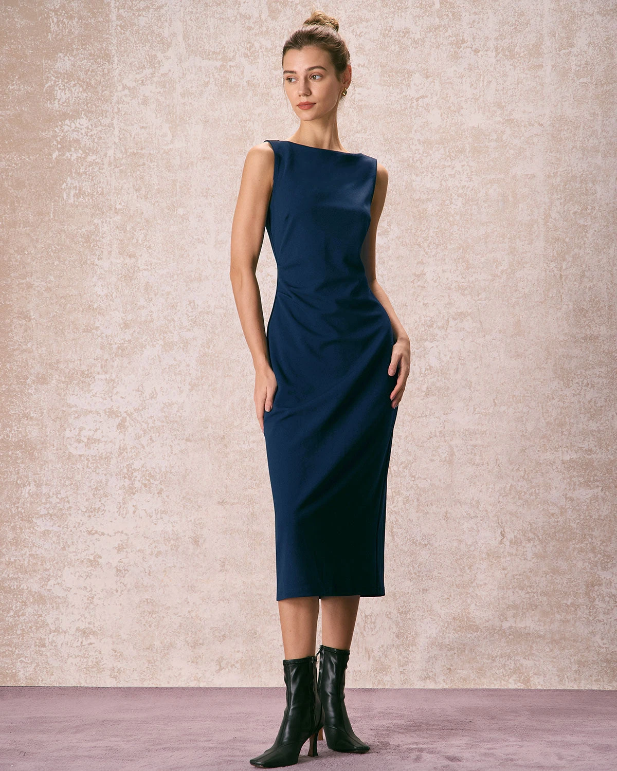 The Navy Boat Neck Ruched Midi Dress