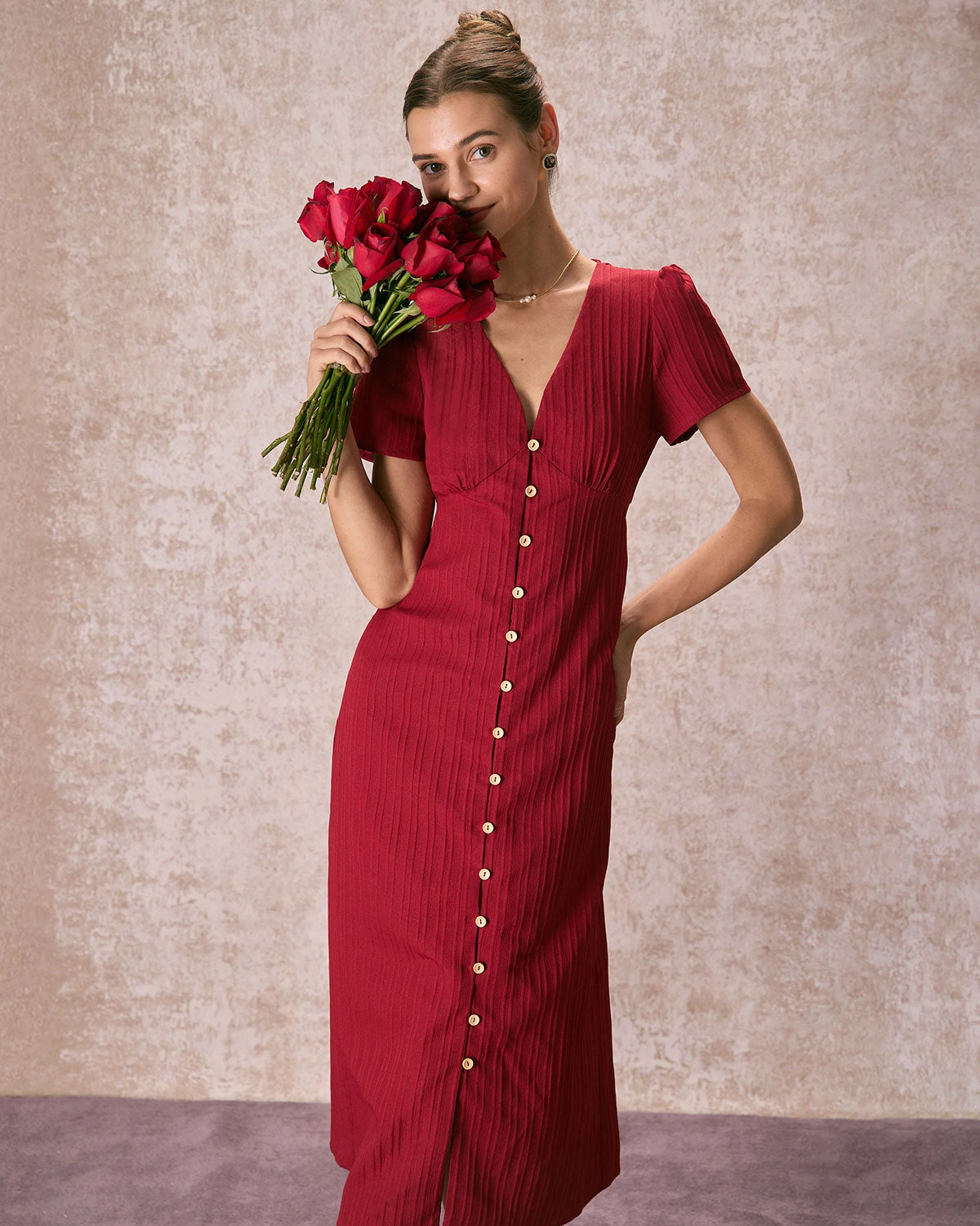 This V Neck Midi Dress is made of Polyester and Spandex. Polyester is an artificial fiber that feels soft, looks lustrous, and dries fast. It’s also durable, with good resistance to wrinkles, stains, and sunlight.
