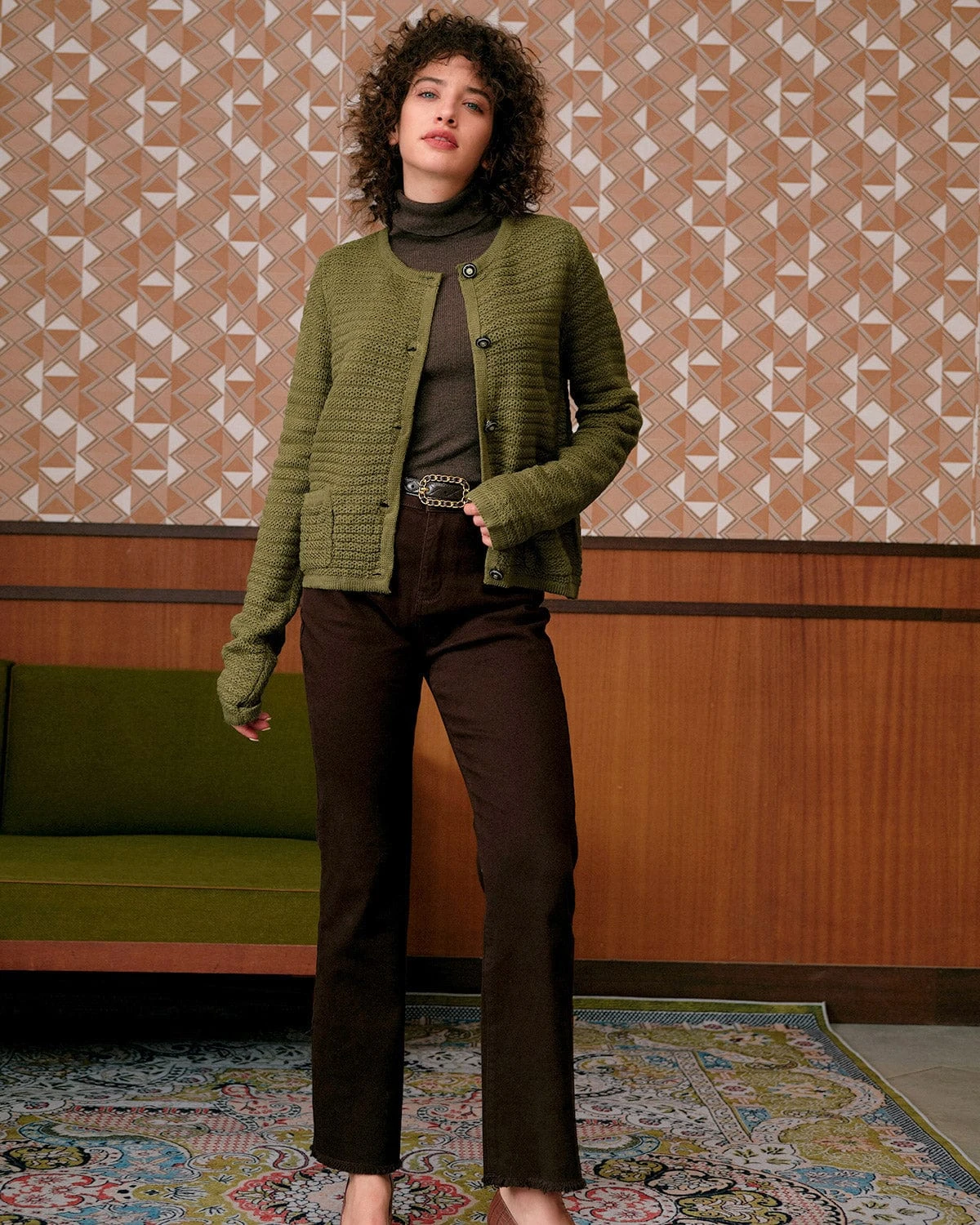 These flare jeans perfectly go with tops of any kind. The combination of flared trouser ends and slim-fitting, as well as the high-waisted design, offers females perfect figure ratios visually, making women higher and slimmer than usual visually, acting as shaping. Plus, its selection of brown color makes it in line with the fall/winter, and the button and zip fly closure is practical.