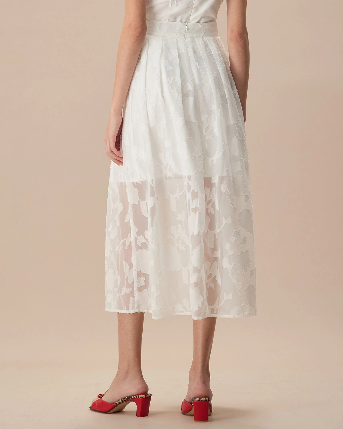 Crafted from luxurious jacquard fabric, this white skirt features a high-waisted design that accentuates the waist and elongates the silhouette. The intricate jacquard pattern adds texture and visual interest, making it a standout piece for both formal and casual occasions.Â