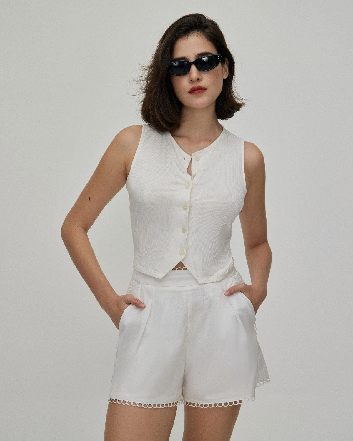 Impeccably tailored with a high-waisted silhouette, these wide-leg shorts offer both comfort and style. The high-rise design cinches at the waist, accentuating your natural curves and creating a flattering hourglass shape. Perfect for elongating the legs, these shorts are versatile enough to transition seamlessly from day to night. Adorned with intricate lace trim detailing, these shorts add a touch of romance to any ensemble.