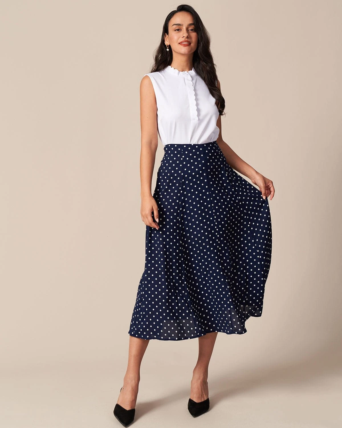 How relaxed this Button Top is with a pair of high-waisted jeans! It comes with mock neck, button and sleeveless design, offering your perfect figure a good chance to be shown. Coupled with scalloped design, it is perfect with high-waisted jeans or skirts.