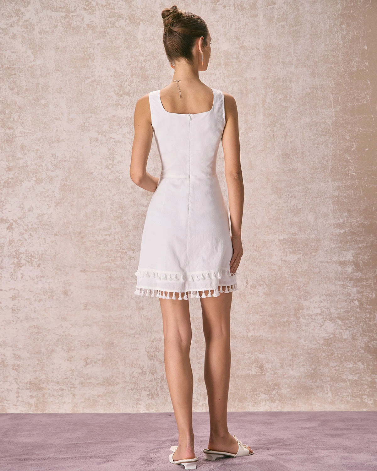 Crafted from lightweight and breathable fabric, this sleeveless mini dress ensures all-day comfort while exuding a sense of breezy charm. The crisp white hue radiates freshness and purity, while the square neckline adds a modern twist to the classic silhouette. The sleeveless design allows for unrestricted movement, making it ideal for outdoor gatherings, beach parties, or brunches with friends. Delicate tassel details adorn the hemline, infusing the dress with a touch of bohemian flair and movement.
